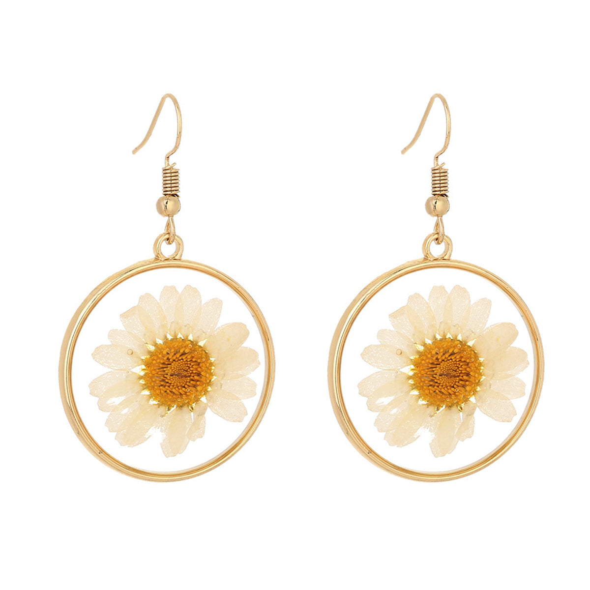 Accent your accessories with the floral-featured style of these round pressed-mum drop earrings.