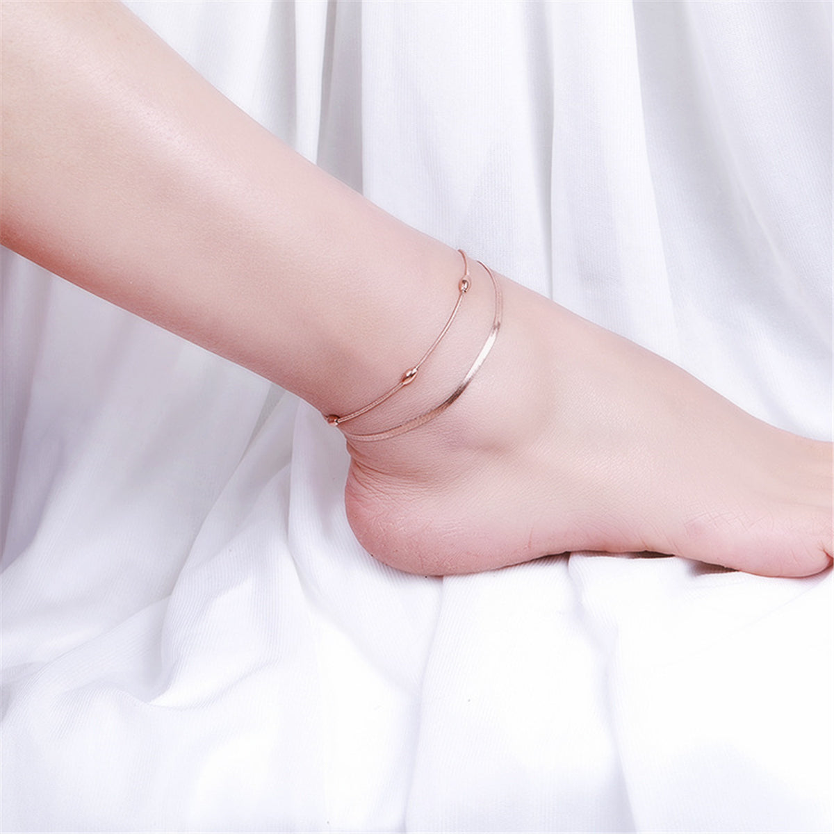 Layered anklet featuring a snake chain and beaded accents with a lustrous 18k rose gold-plated finish.