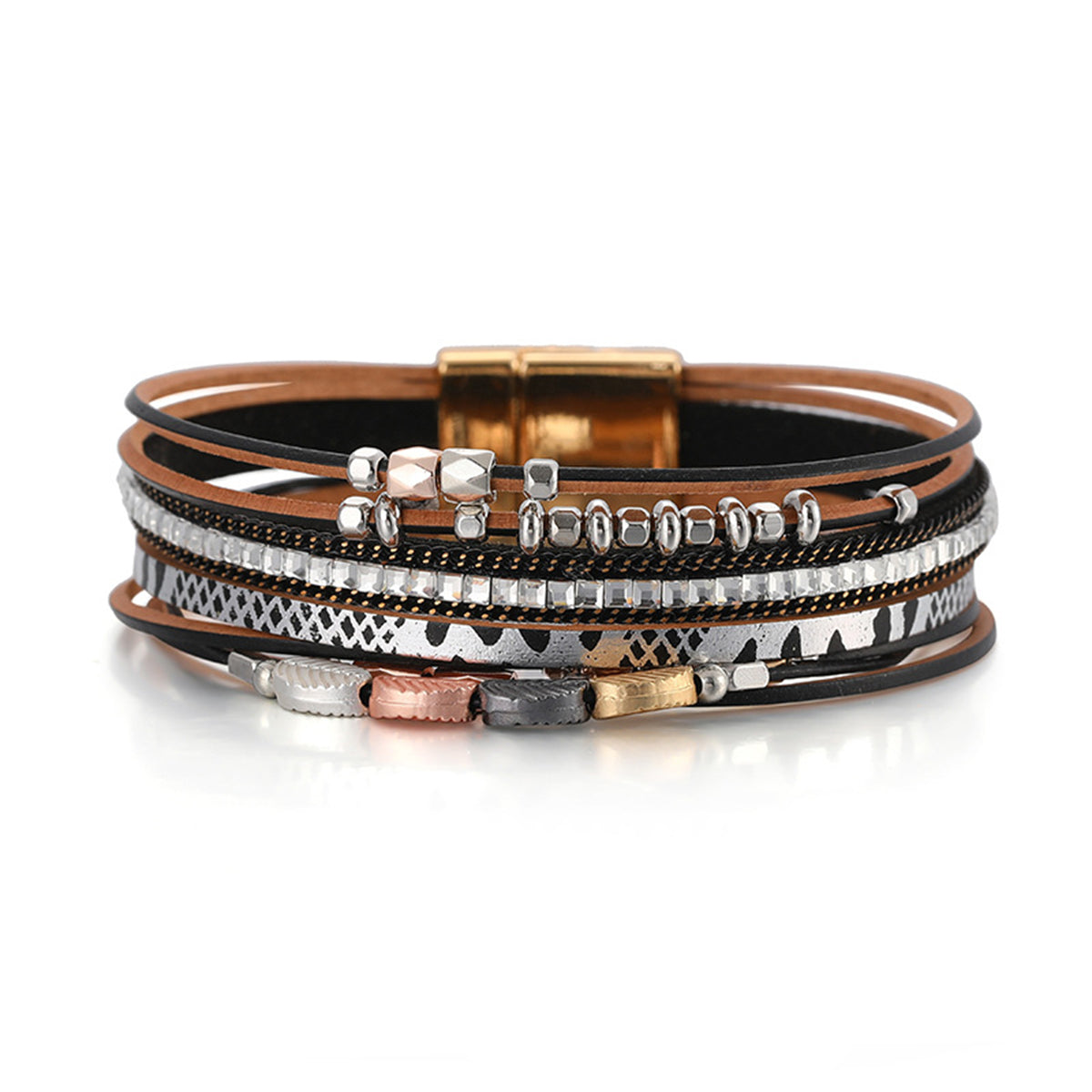 Stylish multi-layer bracelet featuring polystyrene straps, cubic zirconia and 18k gold-plated metal accents.