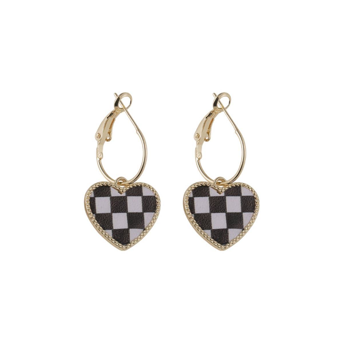 Make a bold move with these drop earrings showcasing a checkerboard pattern on dainty heart silhouettes.