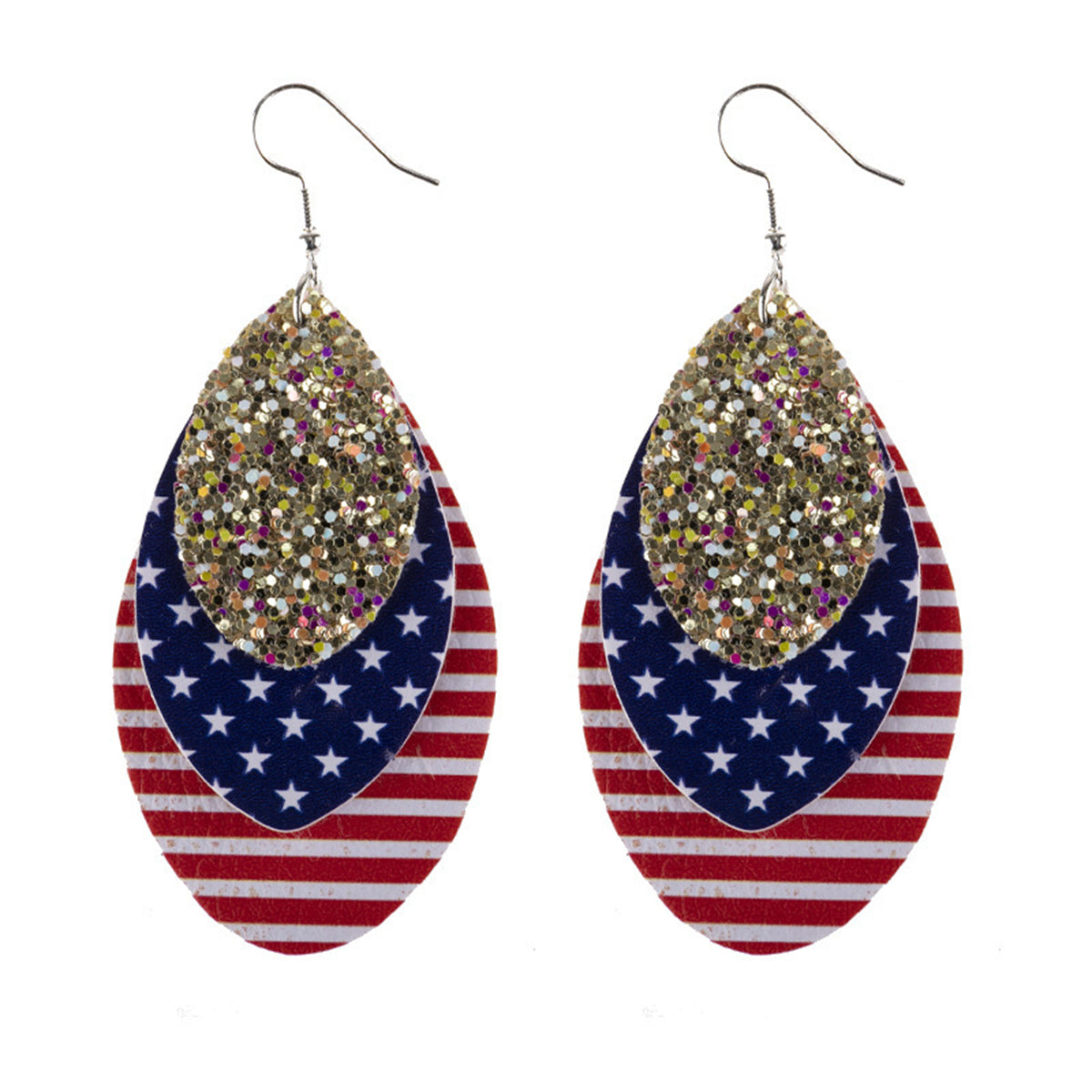 Sparkle from sea to shining sea in these glittery earrings featuring stacked polystyrene teardrops with a patriotic graphic.