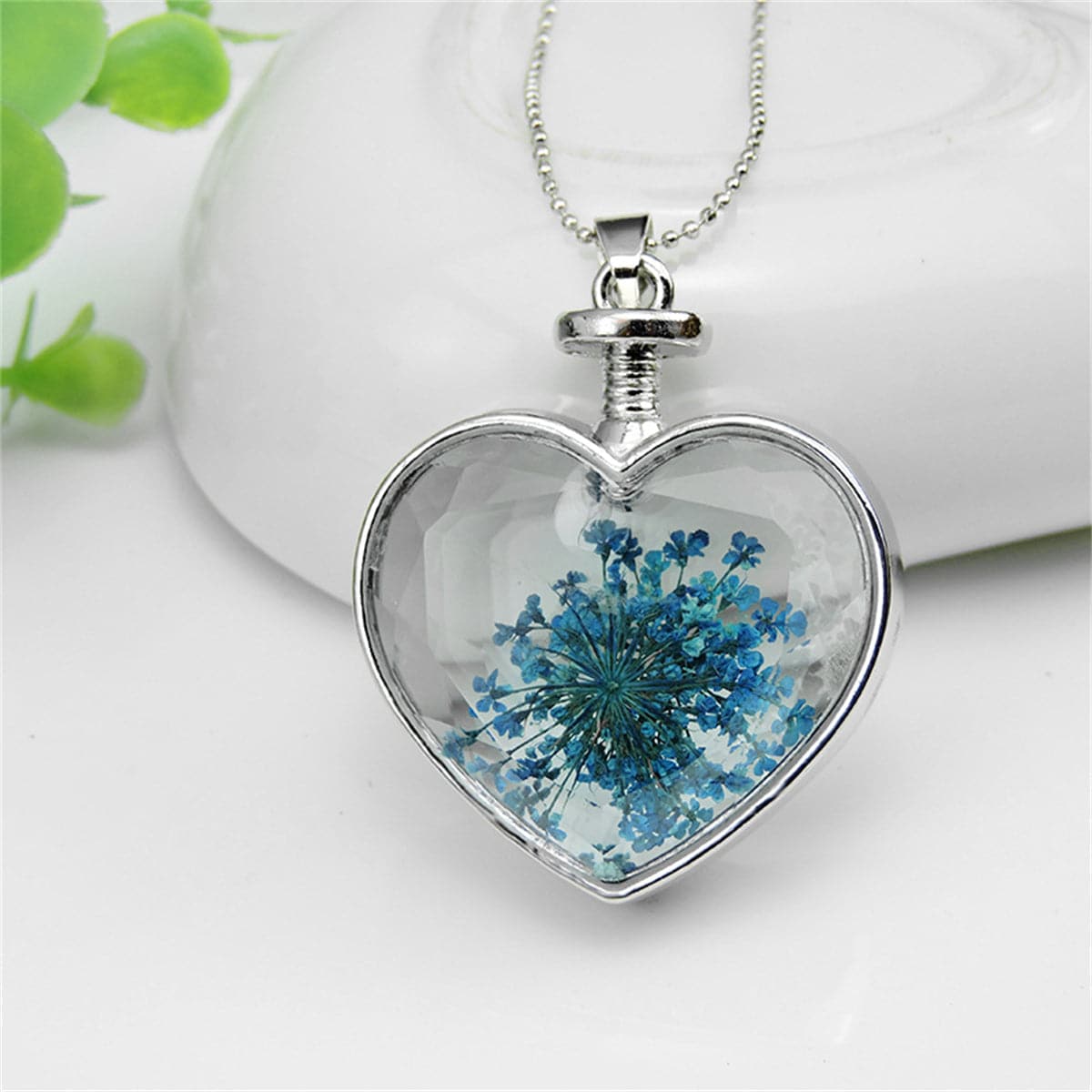 Blue Pressed Gypsophila & Silver-Plated Heart Pendant Necklace