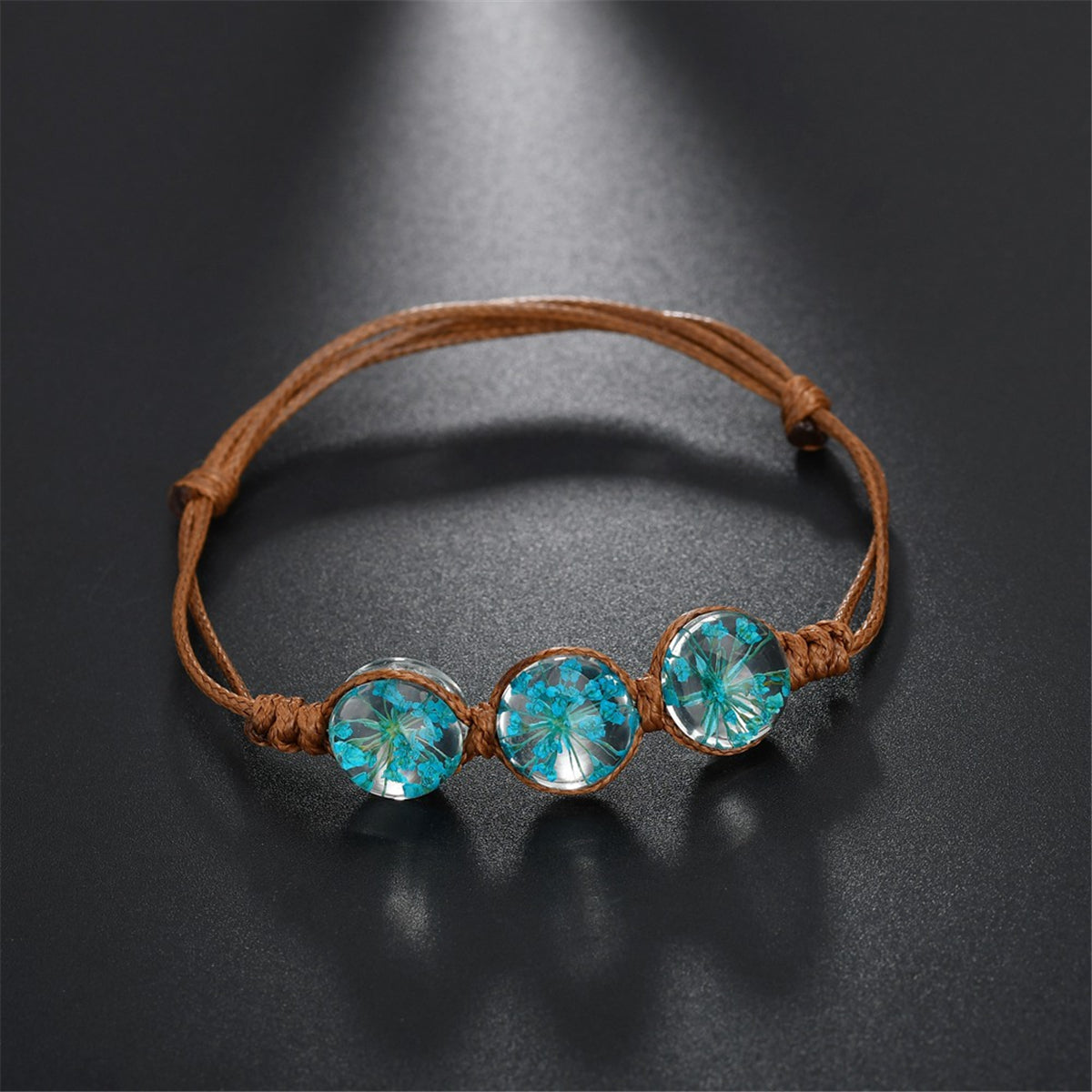 A trio of resin charms encasing real flowers gives this charming bracelet a fresh floral twist. The brown rope-style cord has an easy-to-adjust sliding closure for a customized fit.