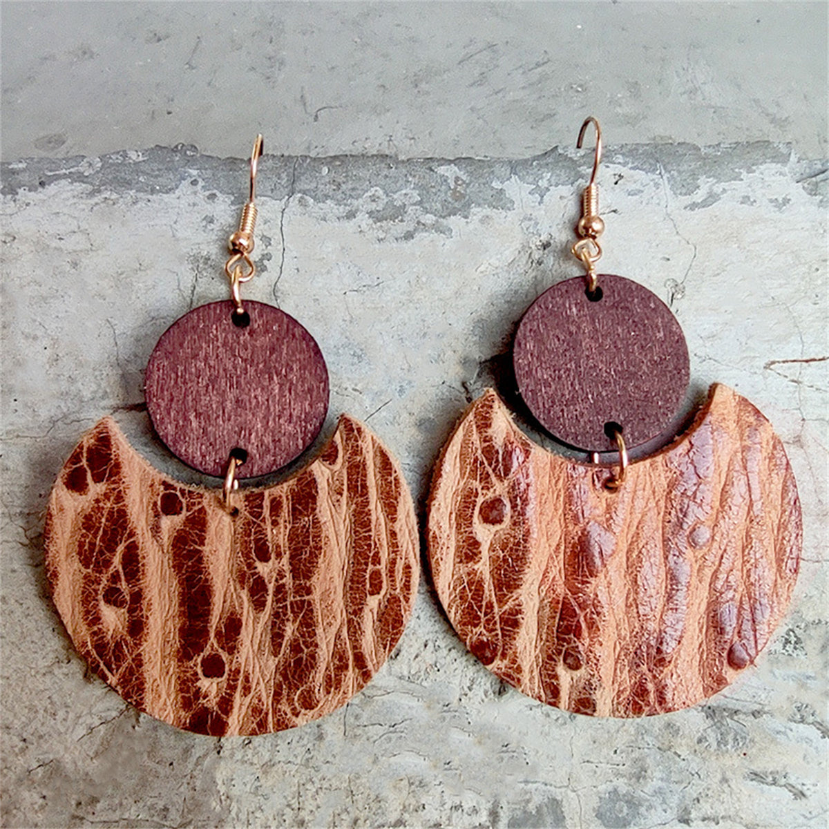 Unique wooden drop earrings featuring an abstract design and round shape.