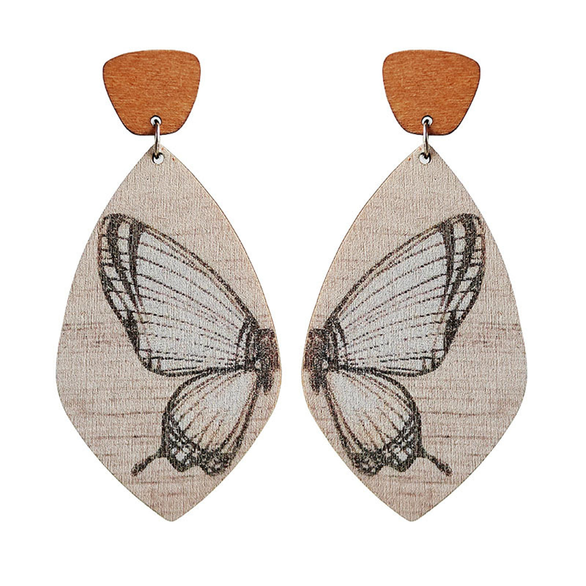 Whimsical wooden drop earrings featuring a unique design.