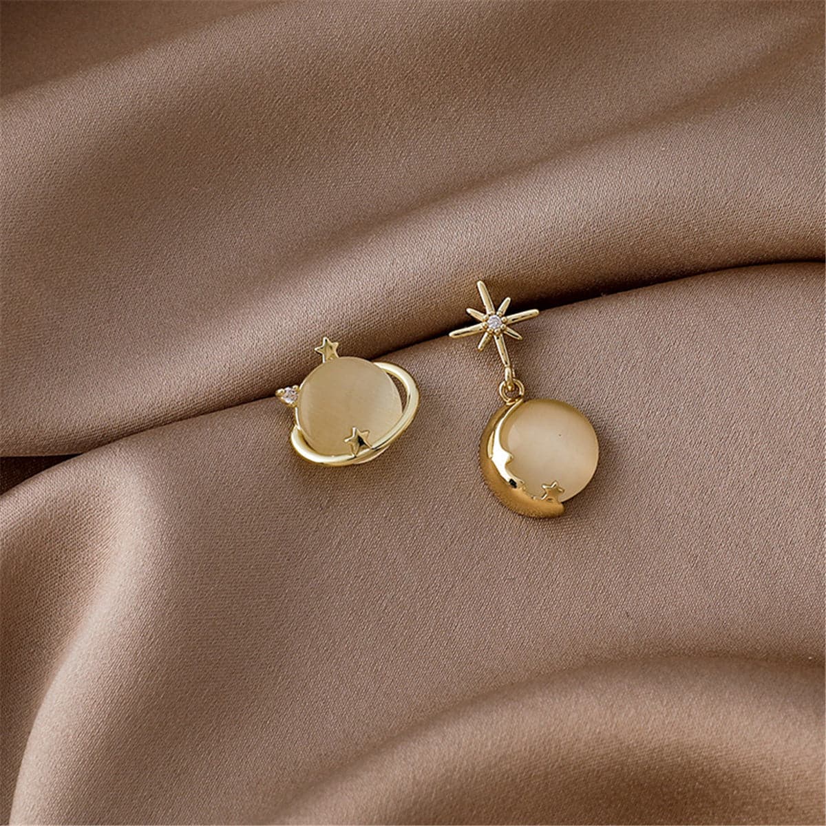 Sparkle with the celestial elegance of these 18-karat gold-plated asymmetrical earrings. Twinkling cubic zirconia accent this dazzling pair, which features a planet cat-eye stud and a round cat-eye drop earring with a star post.