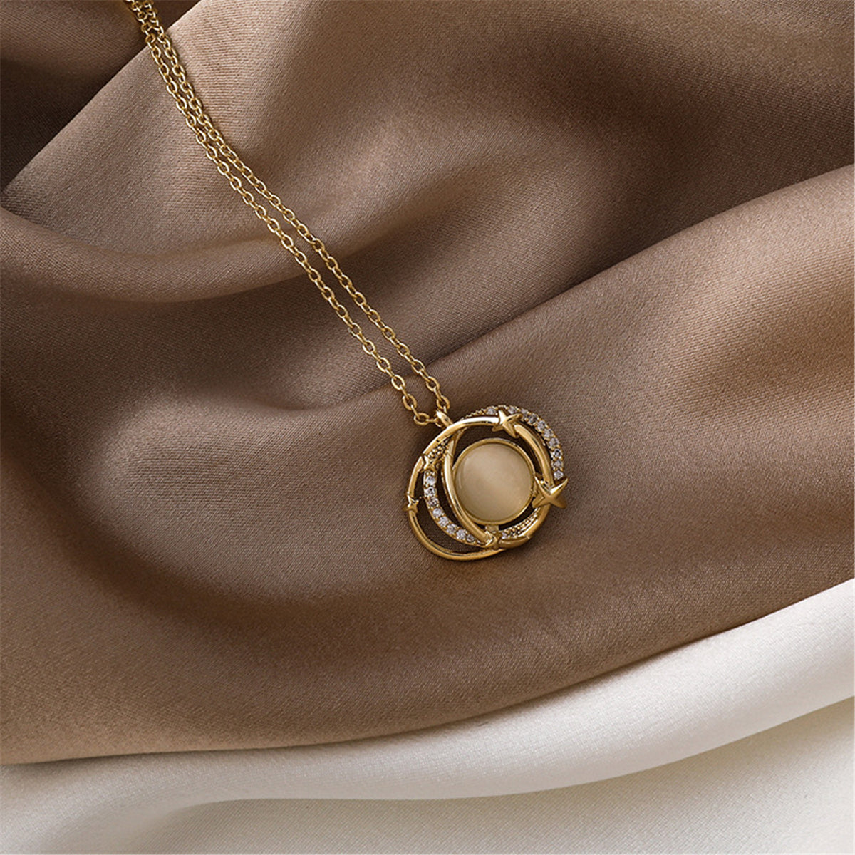 Instantly elevate ensembles with this elegant pendant necklace boasting 18k gold-plated metal, sparkling cubic zirconia and bold cats eye.