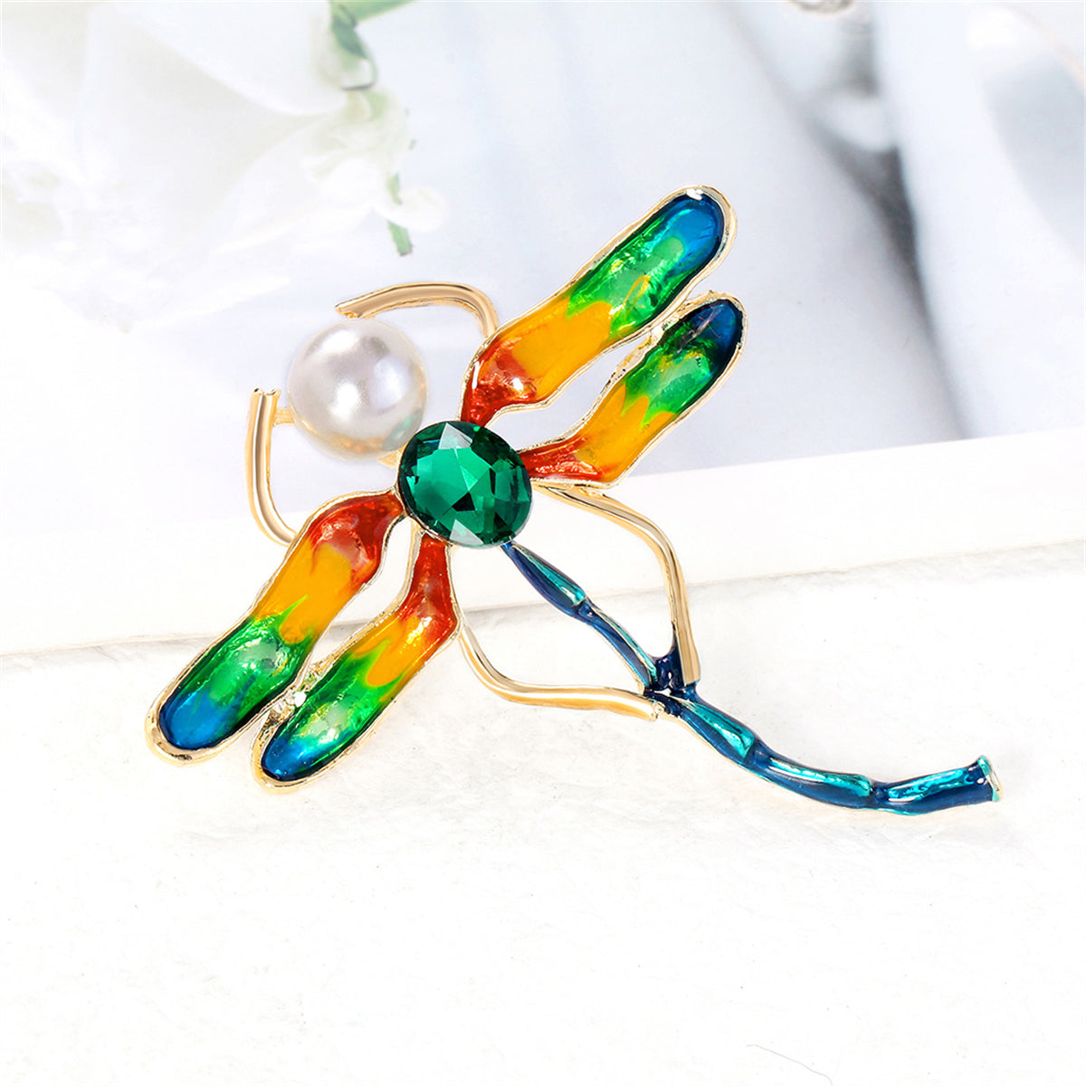 Brooch featuring colorful crystals and a pearl accent.