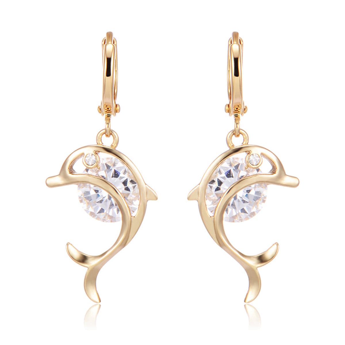 Add a splash of aquatic elegance to your daily looks with these elegant dolphin drop earrings, cast in a warm 18k gold-plated beset with sparkling cubic zirconia.