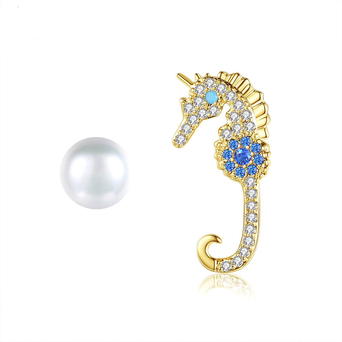 Unique mismatched earrings featuring a pearl stud and a sparkling cubic zirconia-encrusted seahorse.