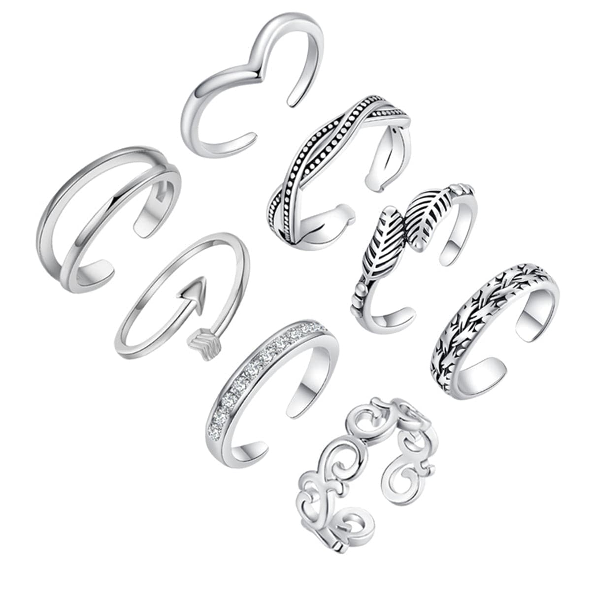 • Includes one twisted toe ring, one chevron toe ring, one double-band toe ring, one arrow toe ring, one leaf toe ring, one swirl toe ring, one textured toe ring and one pavé toe ring (eight pieces total)