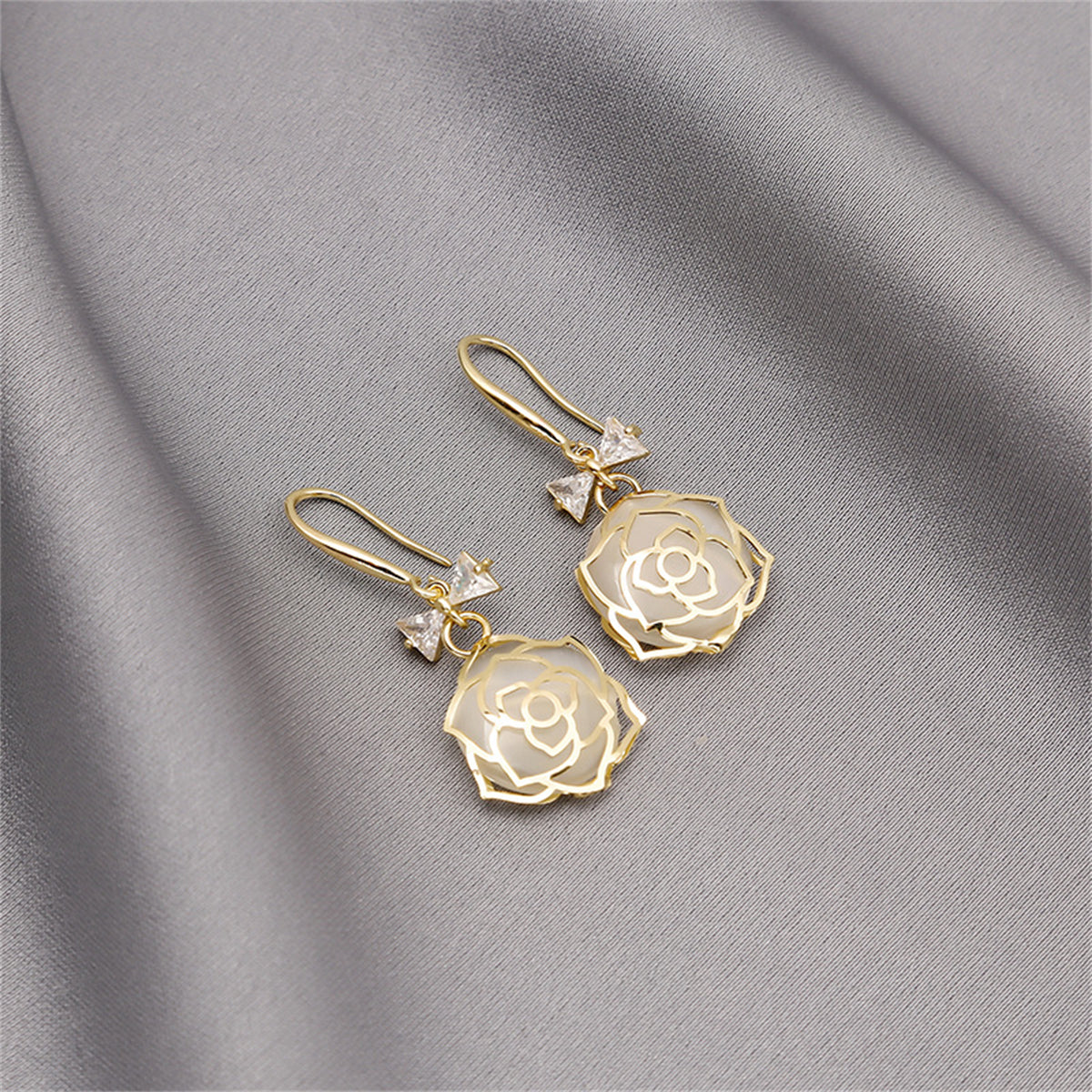 Layering an openwork rose over a round cat-eye charm, these dainty bow-bedecked earrings make your outfit bloom.