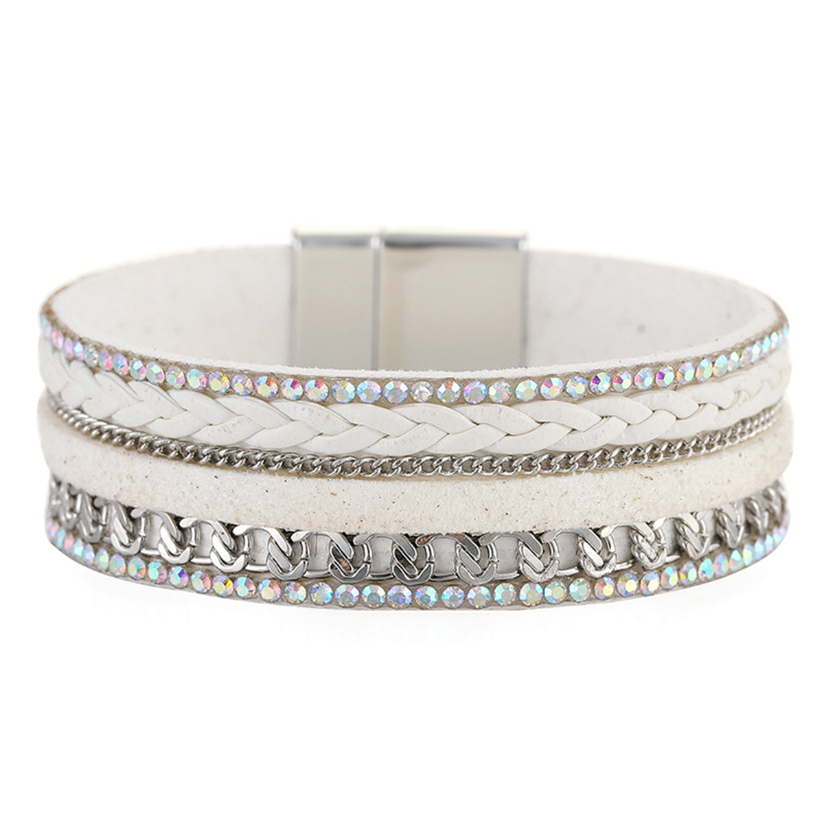 This hinged bangle features a clear frame with silver-plated fabric stripes, rope-chain accents and cubic zirconia gemstones.
