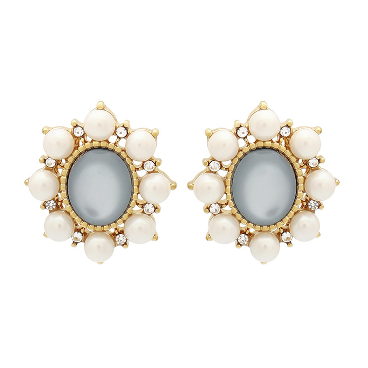 These floral stud earrings feature a dazzling arrangement of pearls surrounding a green cateye stone.