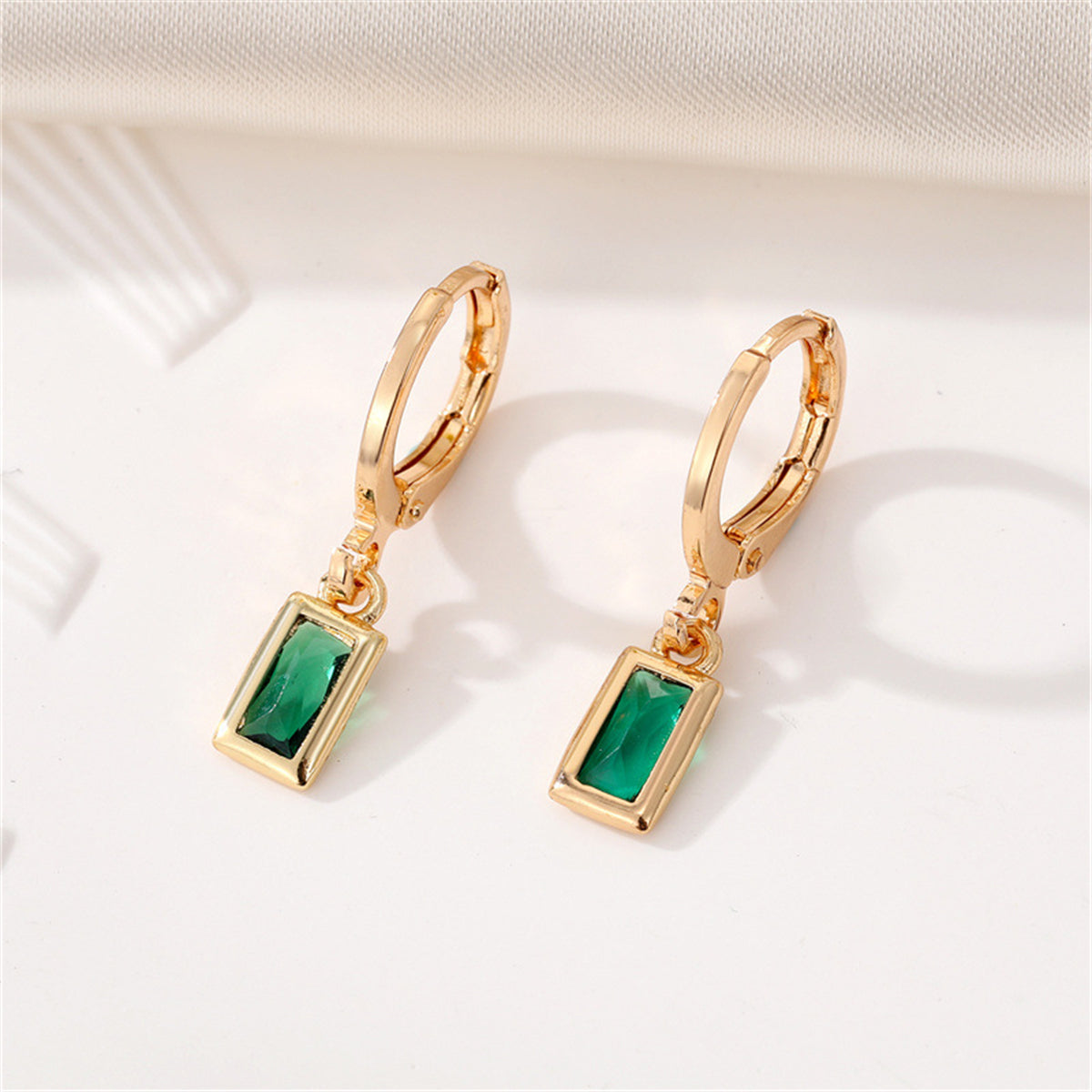 These 18k gold-plated huggie earrings shine with green crystals at the center of each setting.
