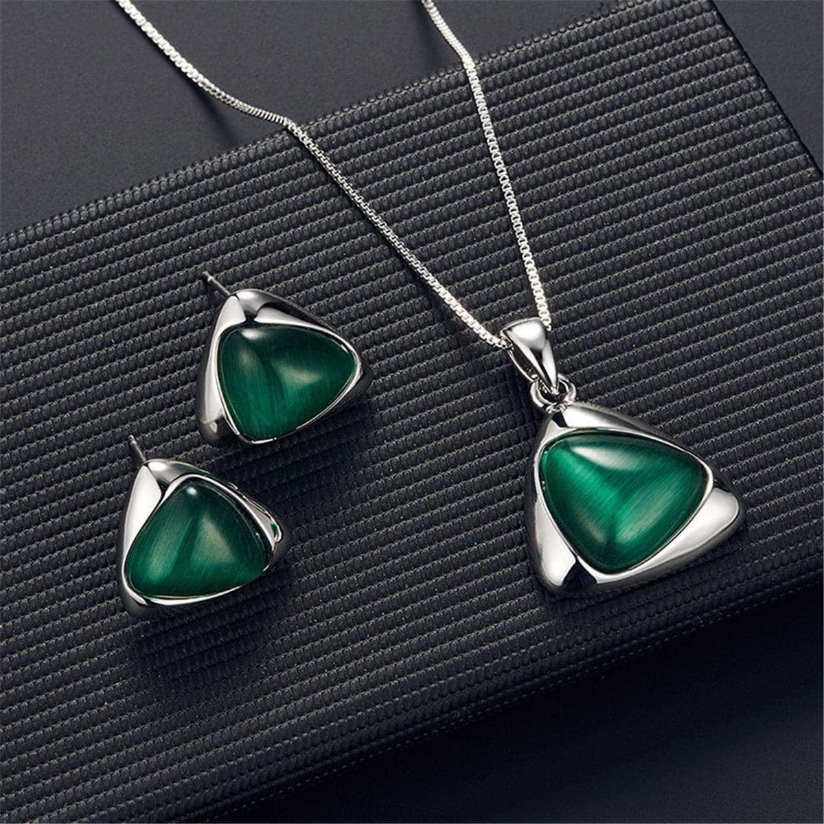 Coordinate your date-night looks with this set that features a gorgeous pendant necklace and stud earrings adorned with cats eye stones.