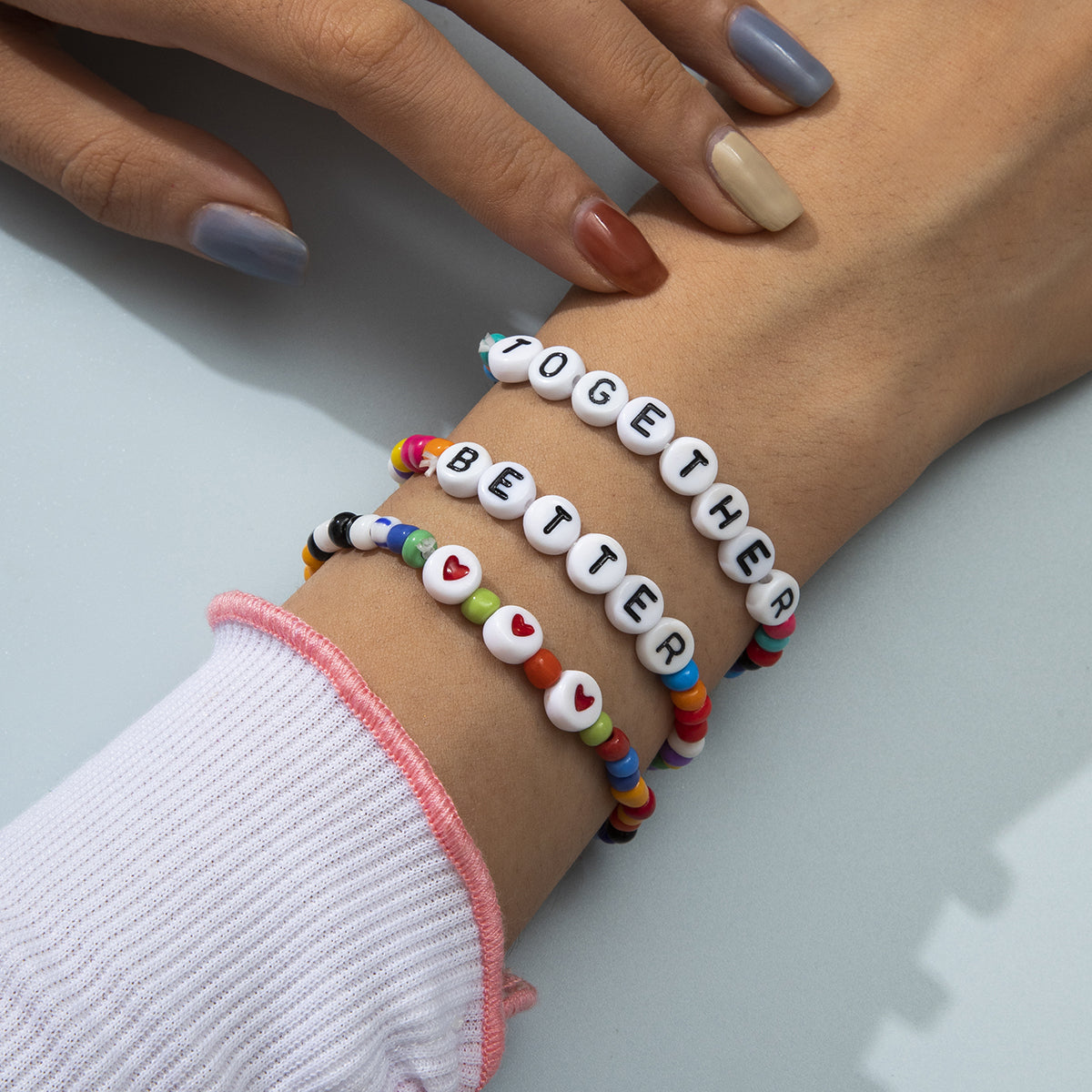 Complete your looks with the bold style of this bracelet set that features a variety of bold, colorful beads and an encouraging message.