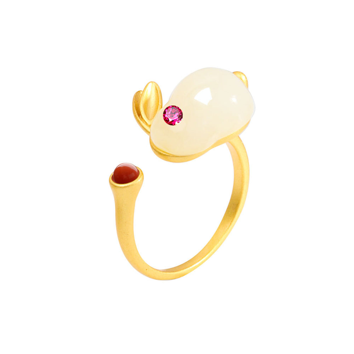 Open 18k gold-plated ring featuring a rabbit made of shaped jade and cubic zirconia accents.