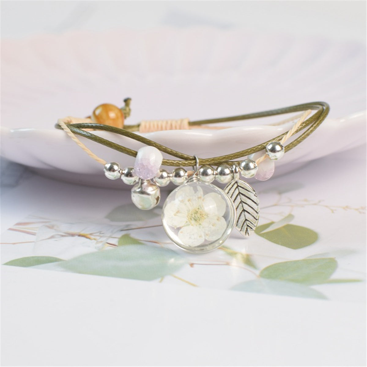 Add a fresh, floral accent to your ensemble with this bracelet boasting an arrangement of charms including a captured peach blossom.