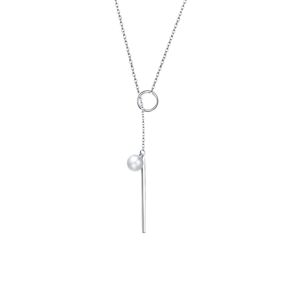 Complete your ensemble with this elegant pendant necklace featuring a milky pearl attached to polished silver-plated bar and ring charms.