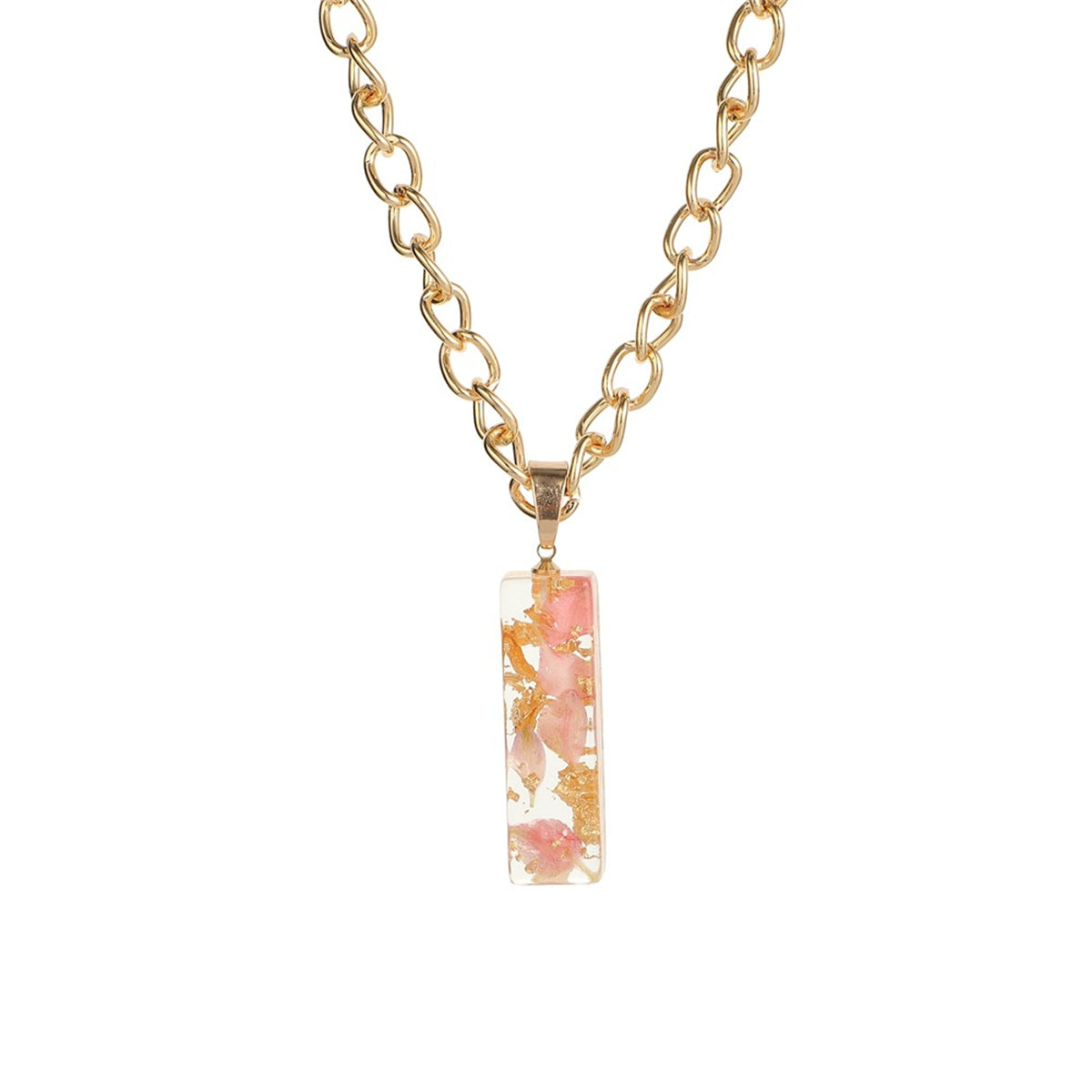This necklace features an 18k gold-plated chain and a flower-filled resin pendant.