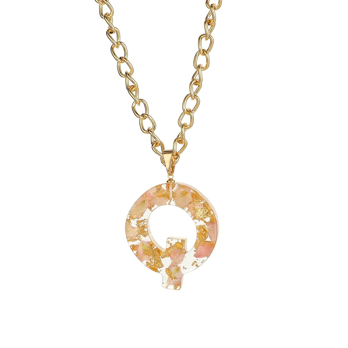 This necklace features an 18k gold-plated chain and a flower-filled resin pendant.