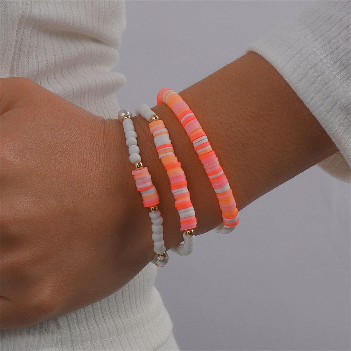 • Includes three pink polymer clay and white howlite beaded stretch bracelets