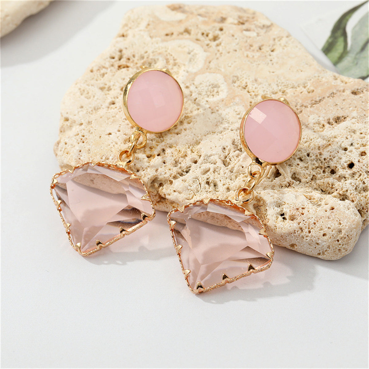 A glittering pair of statement drop earrings designed with quartz bases and faceted blush-tone crystals.