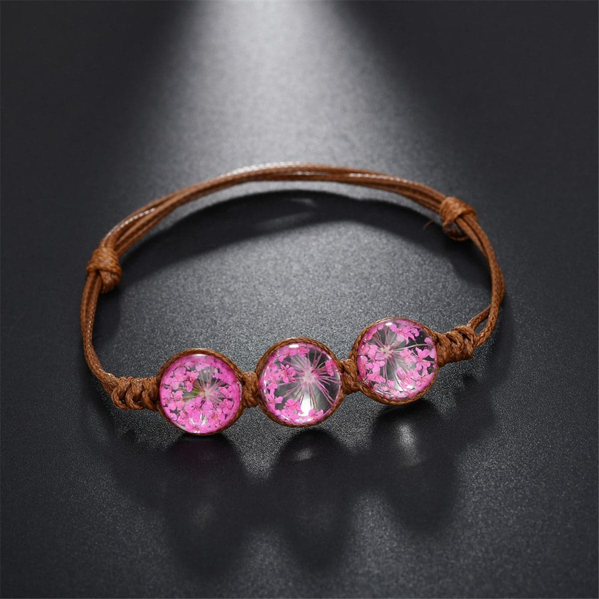 A trio of resin charms encasing real flowers gives this charming bracelet a fresh floral twist. The brown rope-style cord has an easy-to-adjust sliding closure for a customized fit.