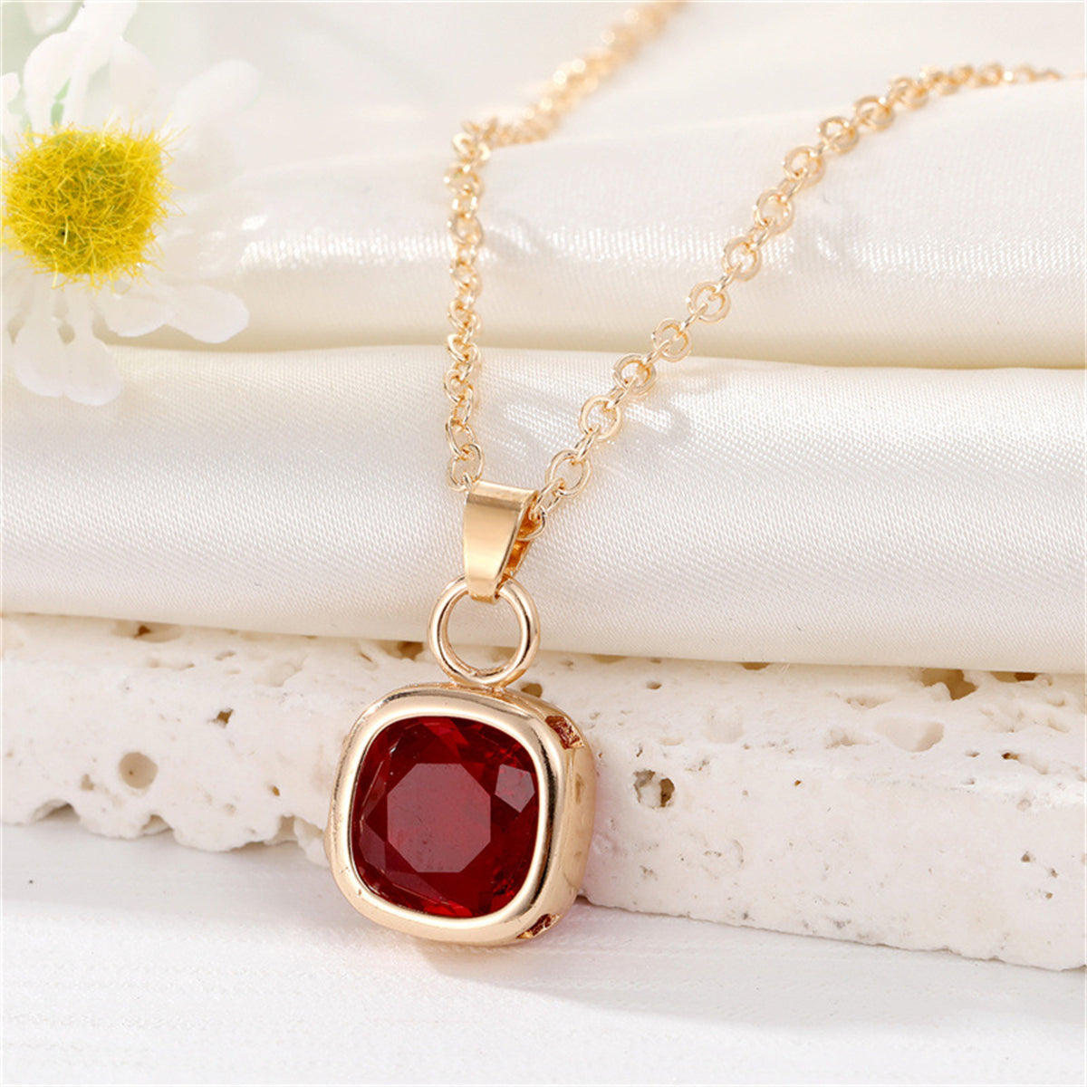 Bring some color to your look with this 18k gold-plated necklace featuring a red crystal pendant.