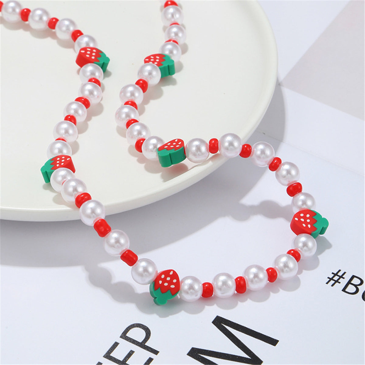 This beaded choker necklace is embellished pearls and sweet strawberries made of polymer clay.