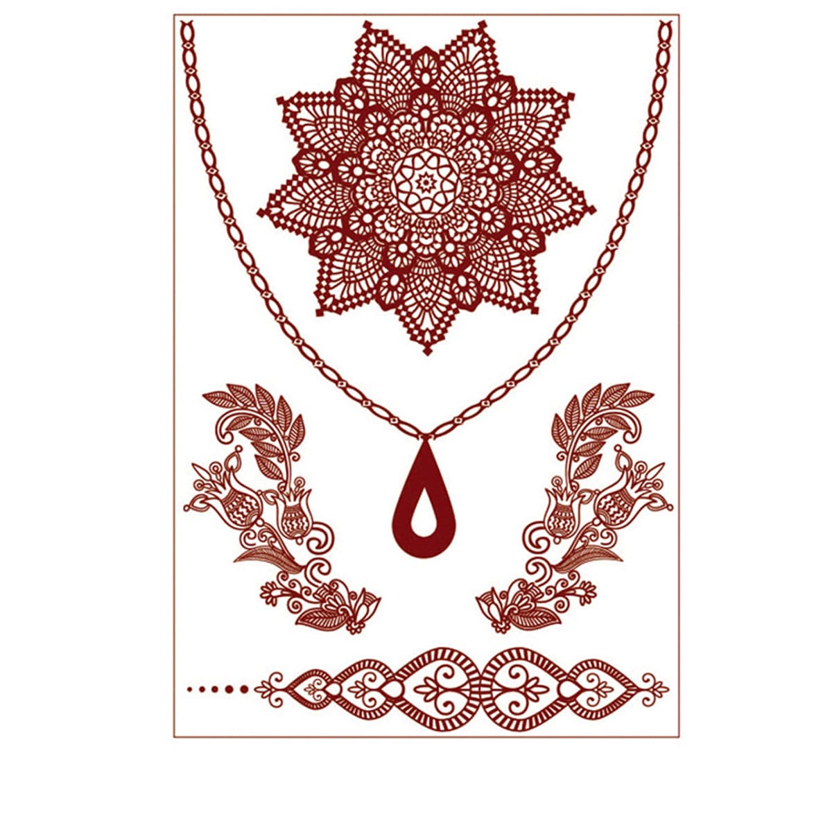 • Includes two red floral temporary tattoos, one paisley stripe temporary tattoo, one pendant necklace temporary tattoo and one mandala temporary tattoo (five pieces total)