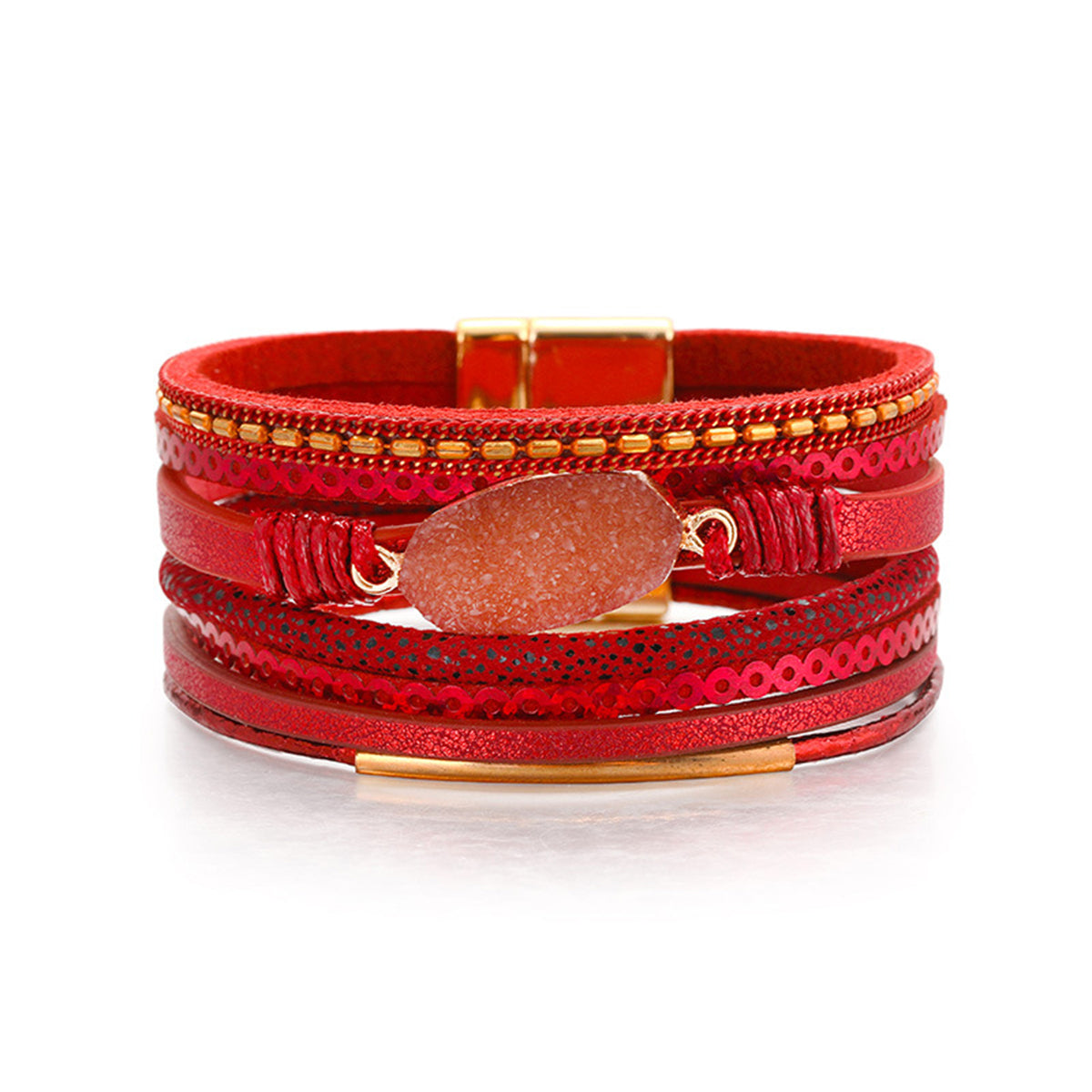 Featuring a resin druzy centerpiece, braided polystyrene and 18k gold-plated accents, this layered bracelet delivers bold color and texture.