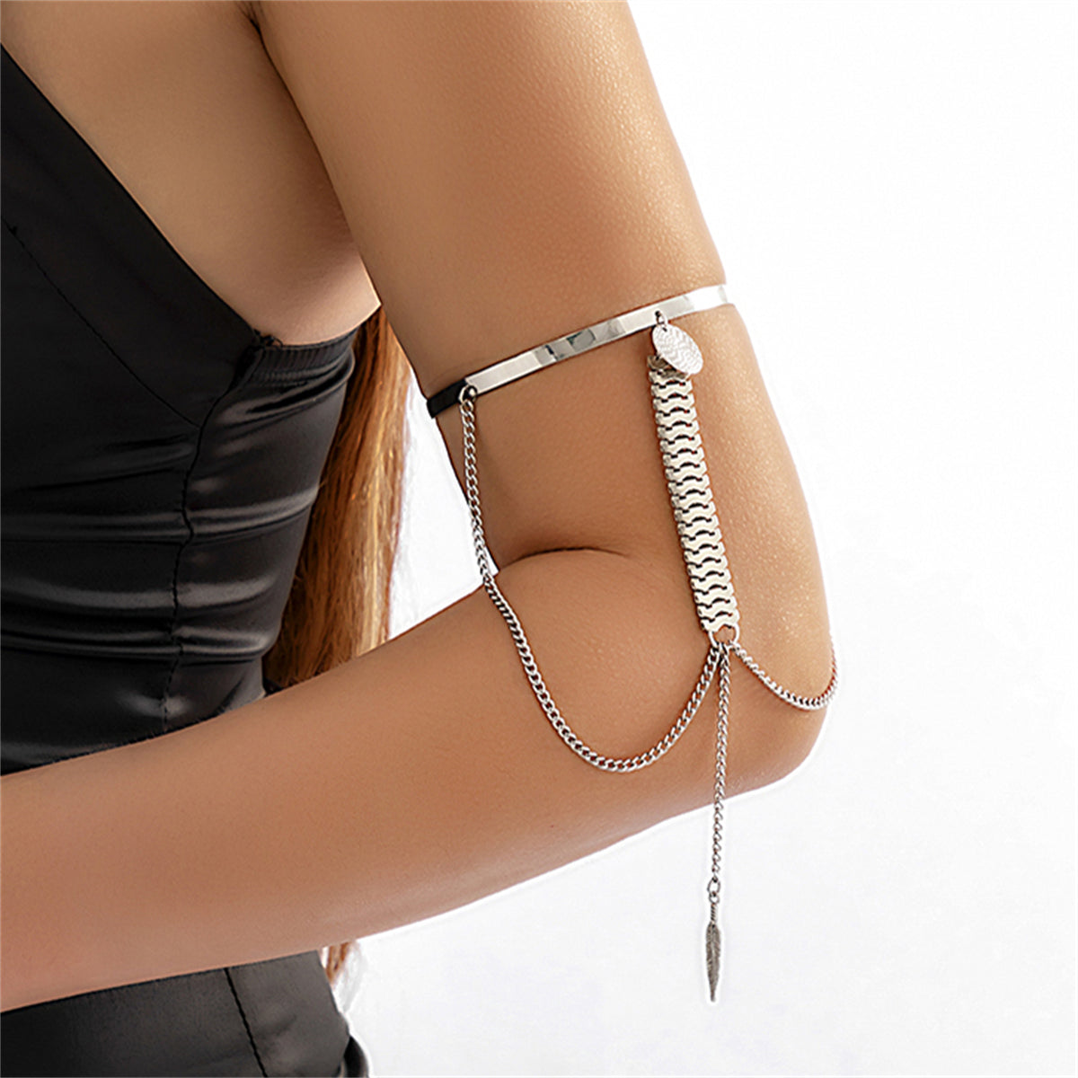 Add creative elegance to your appearance wearing this arm cuff featuring a draping chain and feather pendant.