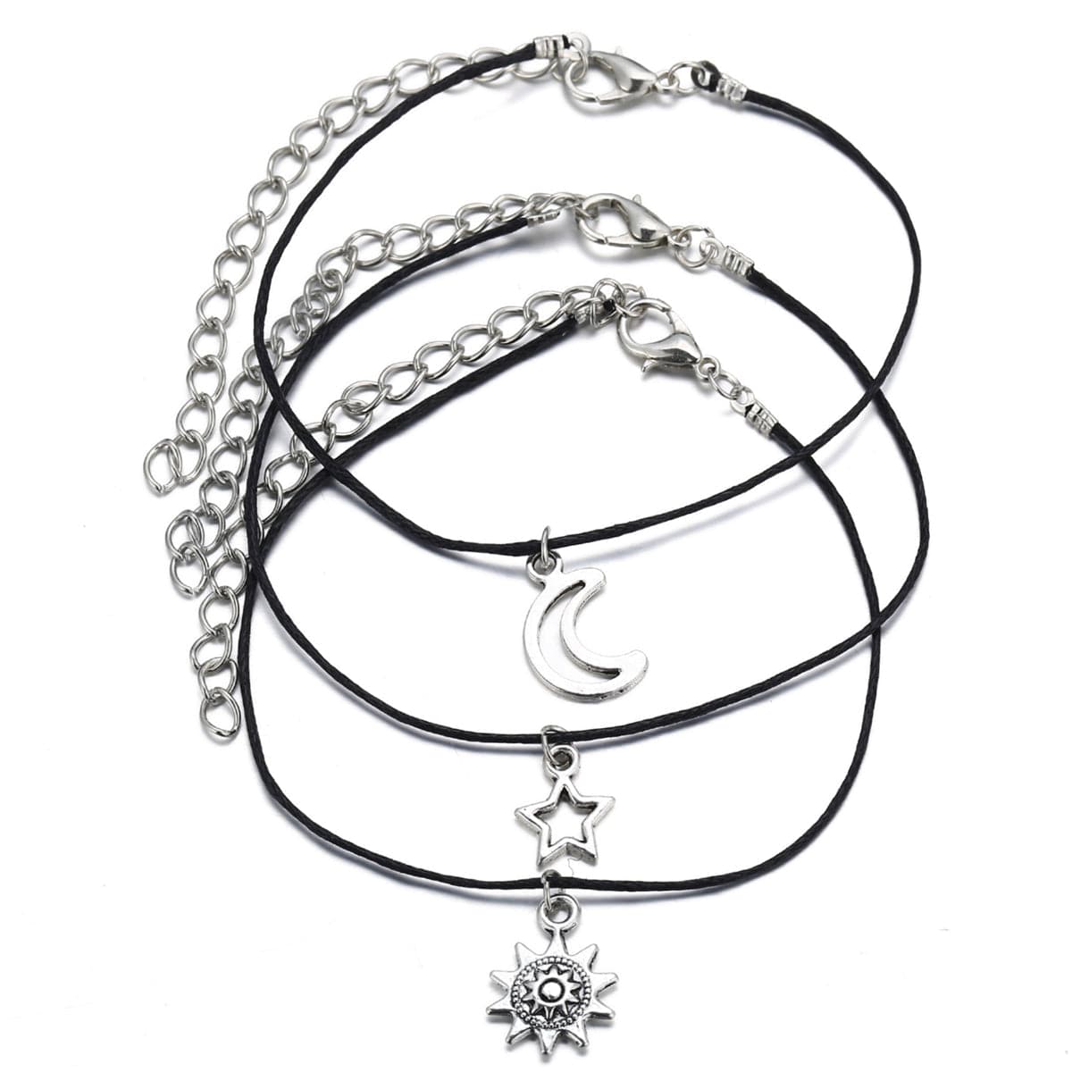 Customize a celestial casual style with this anklet set featuring heavenly charms on black vibre cord.