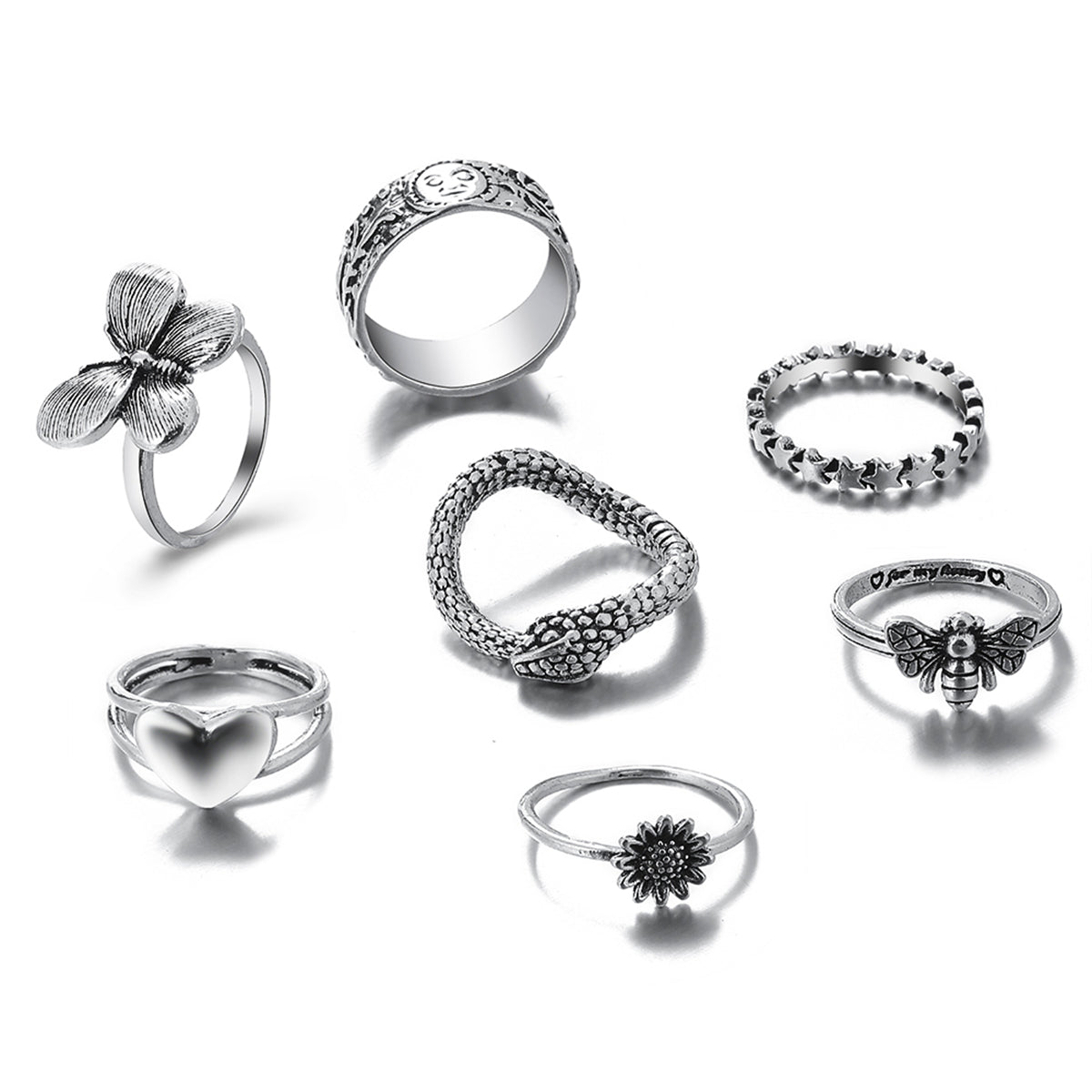 Unique silver-plated ring set that features an eclectic mix for your jewelry collection.