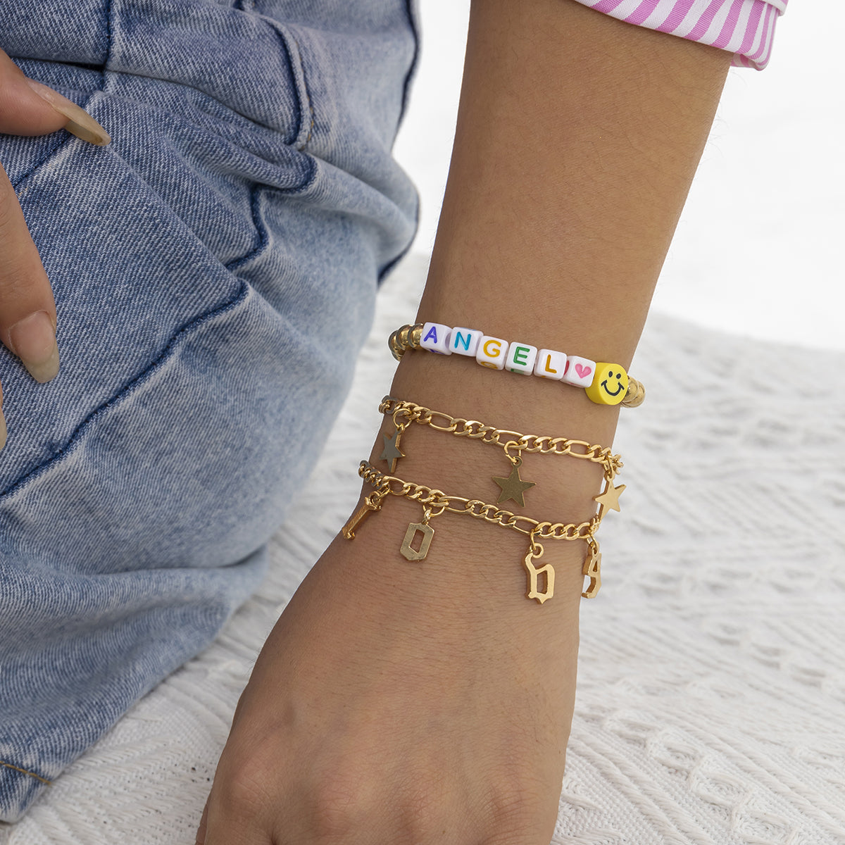 Assorted 18k gold-plated chain and stretch bracelets and star and message charms. Fun acrylic beads.