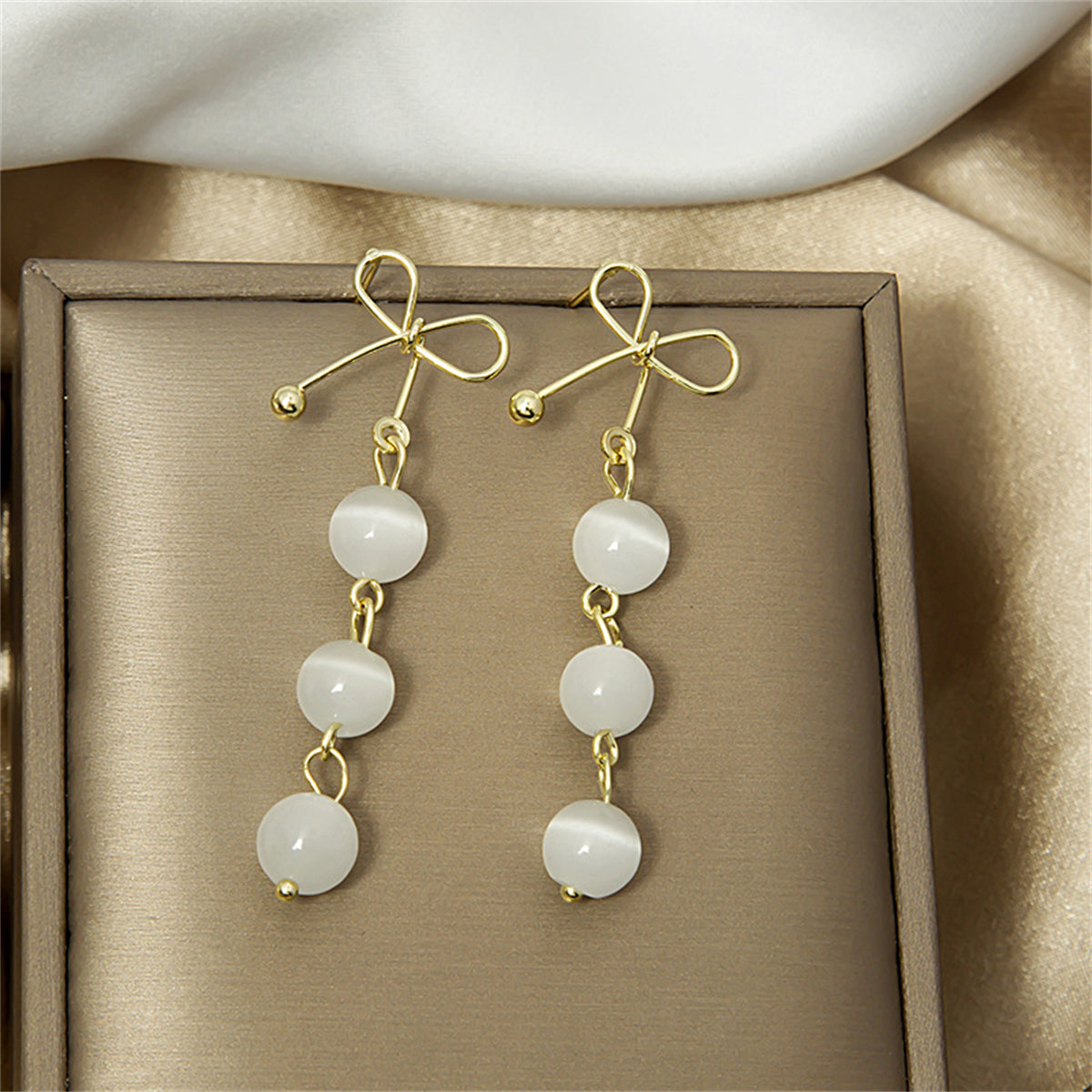Look posh and polished in these dainty earrings featuring three cat-eye circles danging from an openwork bow post.
