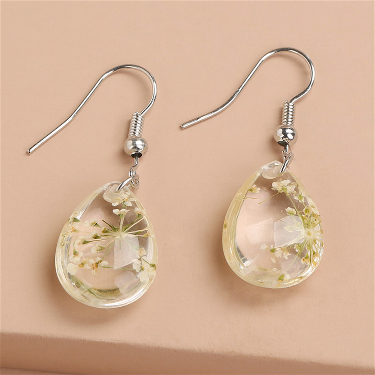 Give your look a botanical touch with these unique earrings that feature petite flowers encased in resin.