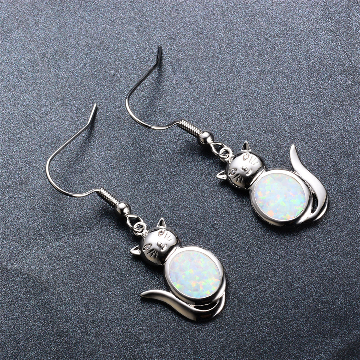 Dangle purrfect style from your lobes with these cat drop earrings embellished with opal centers and an elegant silver-plated finish for iridescent ear-wear.