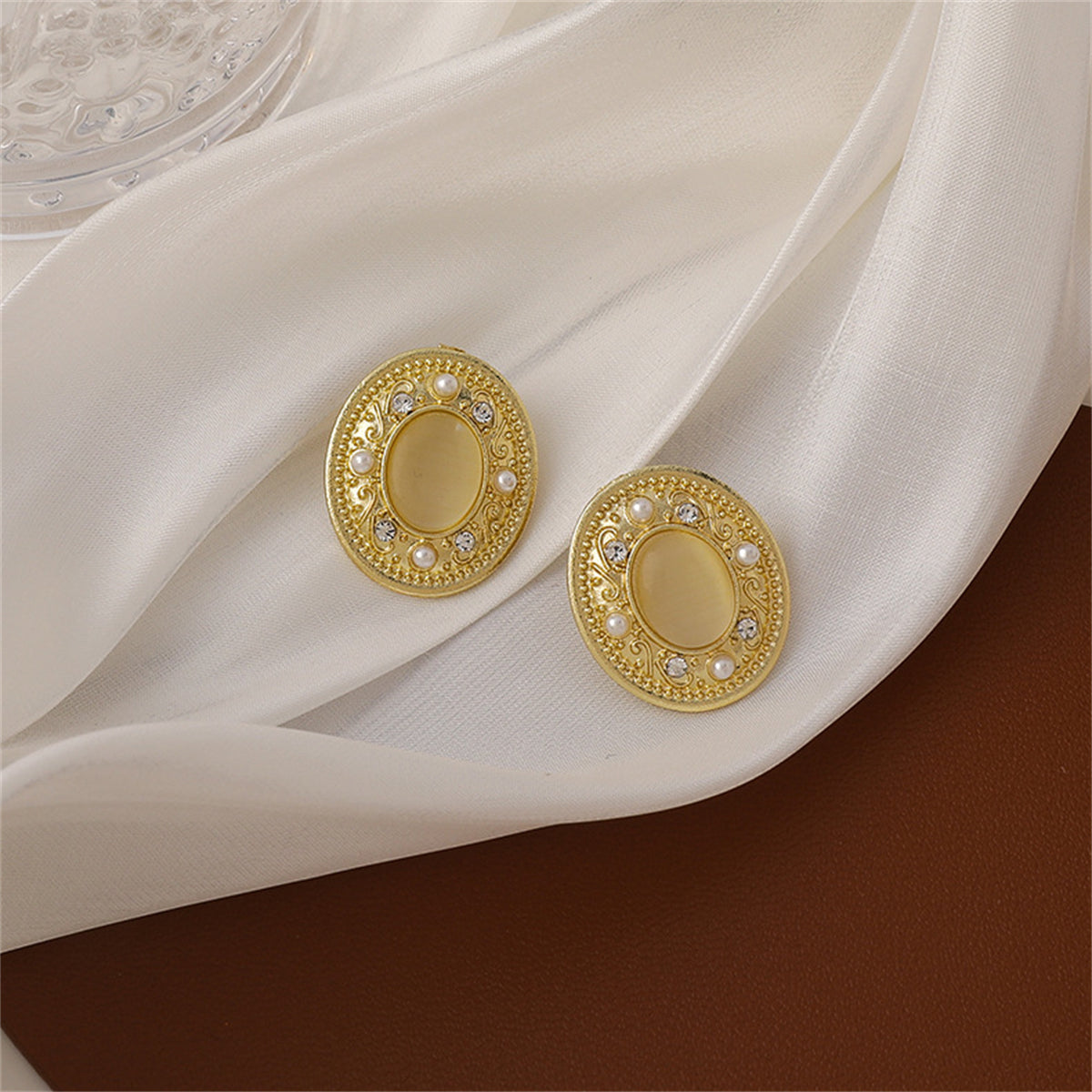 Add personality to your jewelry collection with this pair of eye-catching stud earrings crafted with peals, cubic zirconia and cats eye stones.