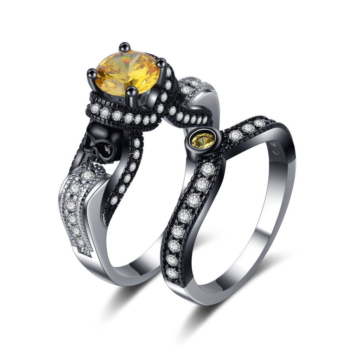 A coordinating ring set featuring sparkling crystals and an edgy skull motif.