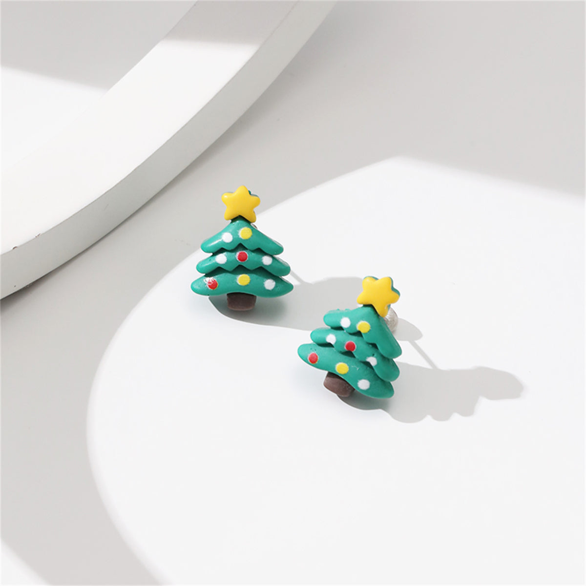 Be merry and bright in these vibrant stud earrings in the shape of decorated evergreen trees.