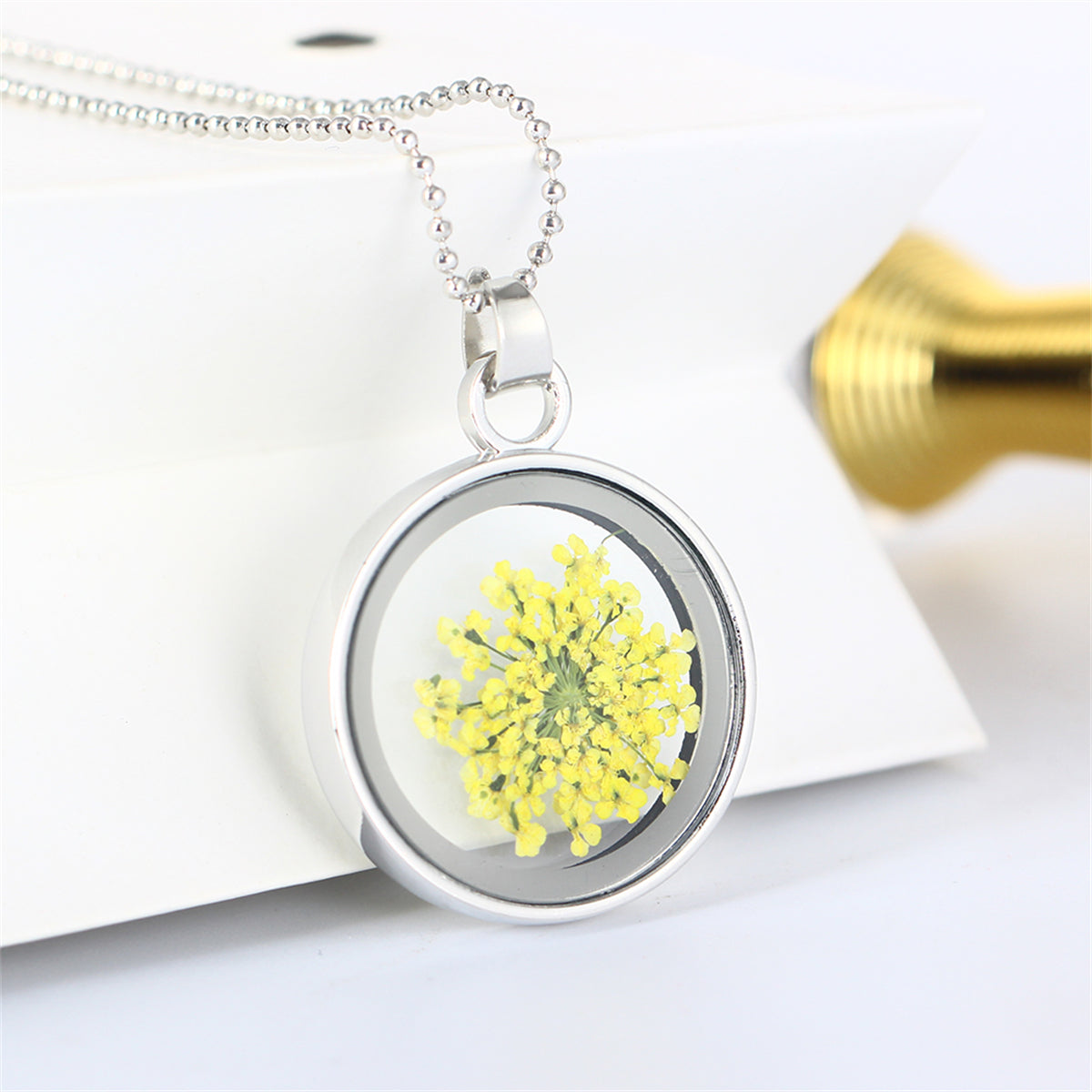 Yellow Gypsophila & Silver-Plated Resin Round Pendant Necklace