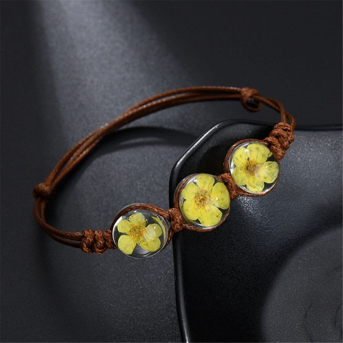 A trio of resin charms encasing real flowers gives this charming bracelet a fresh floral twist. The brown rope-style cord has an easy-to-adjust sliding closure for a customized fit.